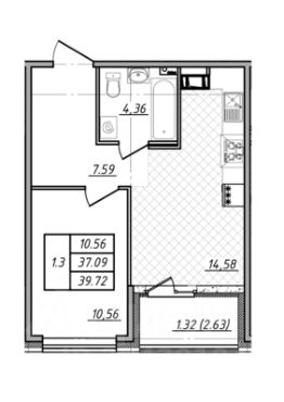 Общая площадь 37 кв.м., кухня 14,58 кв.м.