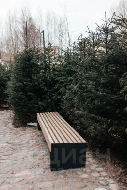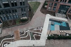 Вечером во дворе включается мягкая рассеянная подсветка и пространство становится уютным и камерным местом для прогулки и расслабления.
