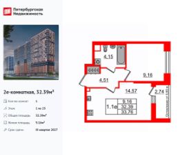 Удобная, классическая, функциональная европланировка, большая кухня-гостиная 14.57 м², просторная прихожая 4.51 м². Общая площадь квартиры - 32.39 м², жилая 9.16 м², высота потолка 2.77 м.