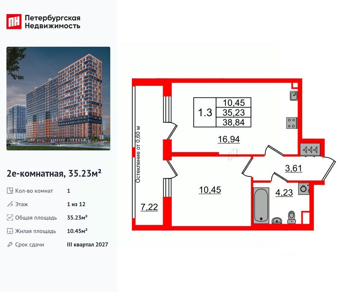 Удобная, классическая, функциональная европланировка, большая кухня-гостиная 16.94 м², вместительная прихожая 3.61 м². Общая площадь квартиры - 35.23 м², жилая 10.45 м², высота потолка 2.77 м.