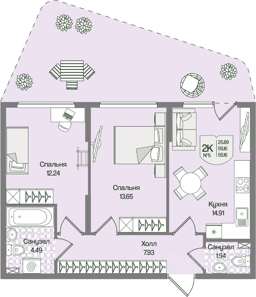 Общая площадь55,16 м²