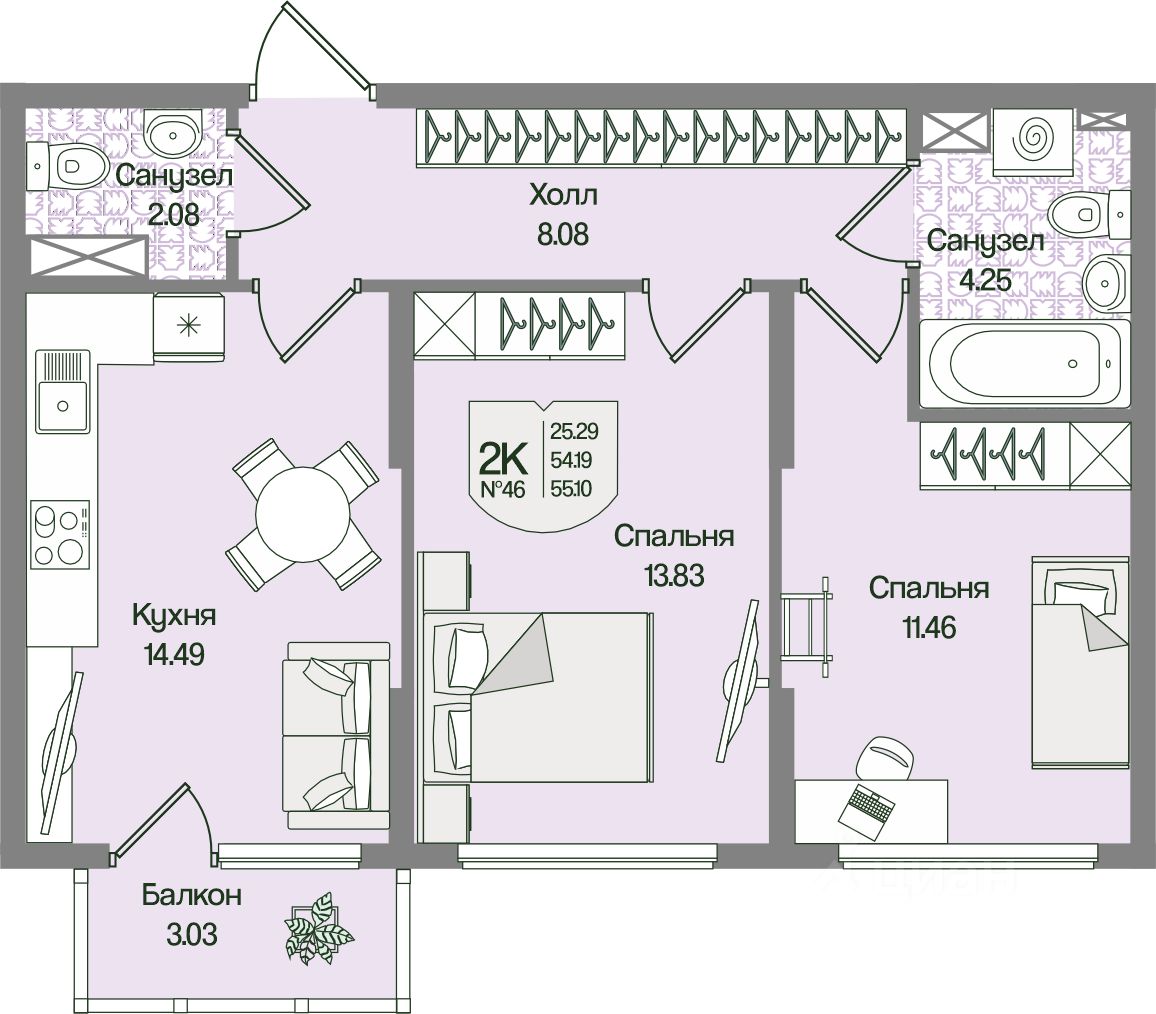 Общая площадь55,1 м²