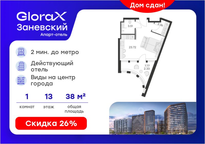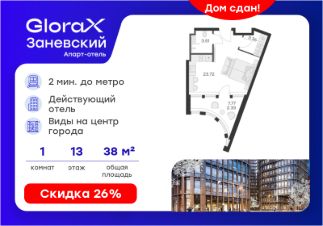 Продается апартамент-студия на 13-м этаже в сданном Апарт-комплексе бизнес-класса "GloraX Заневский". Ключи сразу! Общая площадь лота составляет 32,92 кв. м, из которых 23,72 кв. м отведено под жилую. Номер апартамента - 1 301.