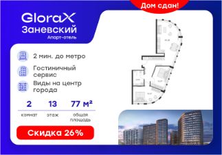 Продается 2-комн. апартамент на 13-м этаже в сданном Апарт-комплексе бизнес-класса "GloraX Заневский". Ключи сразу! Общая площадь лота составляет 79,85 кв. м, из которых 28,94 кв. м отведено под жилую. Номер апартамента - 1 313.