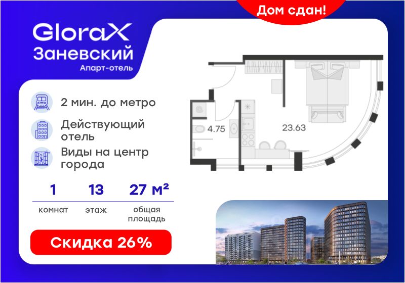 Продается апартамент-студия на 13-м этаже в сданном Апарт-комплексе бизнес-класса "GloraX Заневский". Ключи сразу! Общая площадь лота составляет 28,38 кв. м, из которых 23,63 кв. м отведено под жилую. Номер апартамента - 1 322.