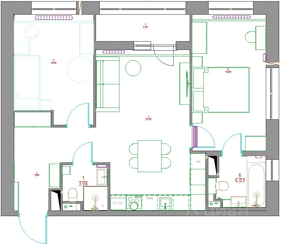 Планировка квартиры соответствует современному тренду комфортной жизни, а именно: мастер-спальня с двумя окнами и выходом в свой санузел с окном (очень много света), отдельна детская/ кабинет, которая расположена отдельно от основной спальни, чтобы повысить комфорт. Две спальни объединяет сердце квартиры-это просторная кухня-гостиная 23 метра с выходом на лоджию, которая в свою очередь разделена на зону готовки и тв зону для отдыха.