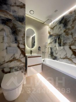 В санузле широкоформатная полированная плитка, встроенная душевая система, подвесная тумба для хранения, встроенная в потолок вытяжка, закарнизная подсветка и подсветка ванной, а также новая стиральная машина