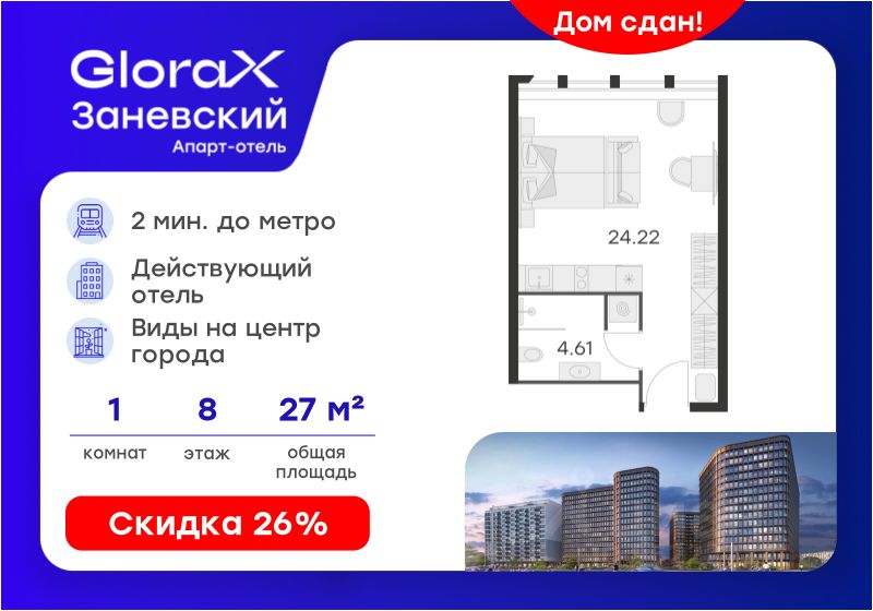 Продается апартамент-студия на 8-м этаже в сданном Апарт-комплексе бизнес-класса "GloraX Заневский". Ключи сразу! Общая площадь лота составляет 28,83 кв. м, из которых 24,22 кв. м отведено под жилую. Номер апартамента - 820.