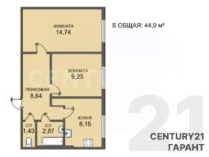 + Общая плoщадь 44,9 кв.м;