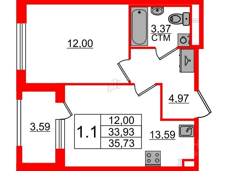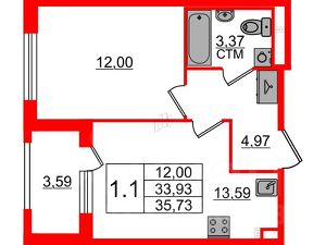 Площадь: 33,93 м2 + 3,59 м2 лоджия, высота потолка 2,75 м.