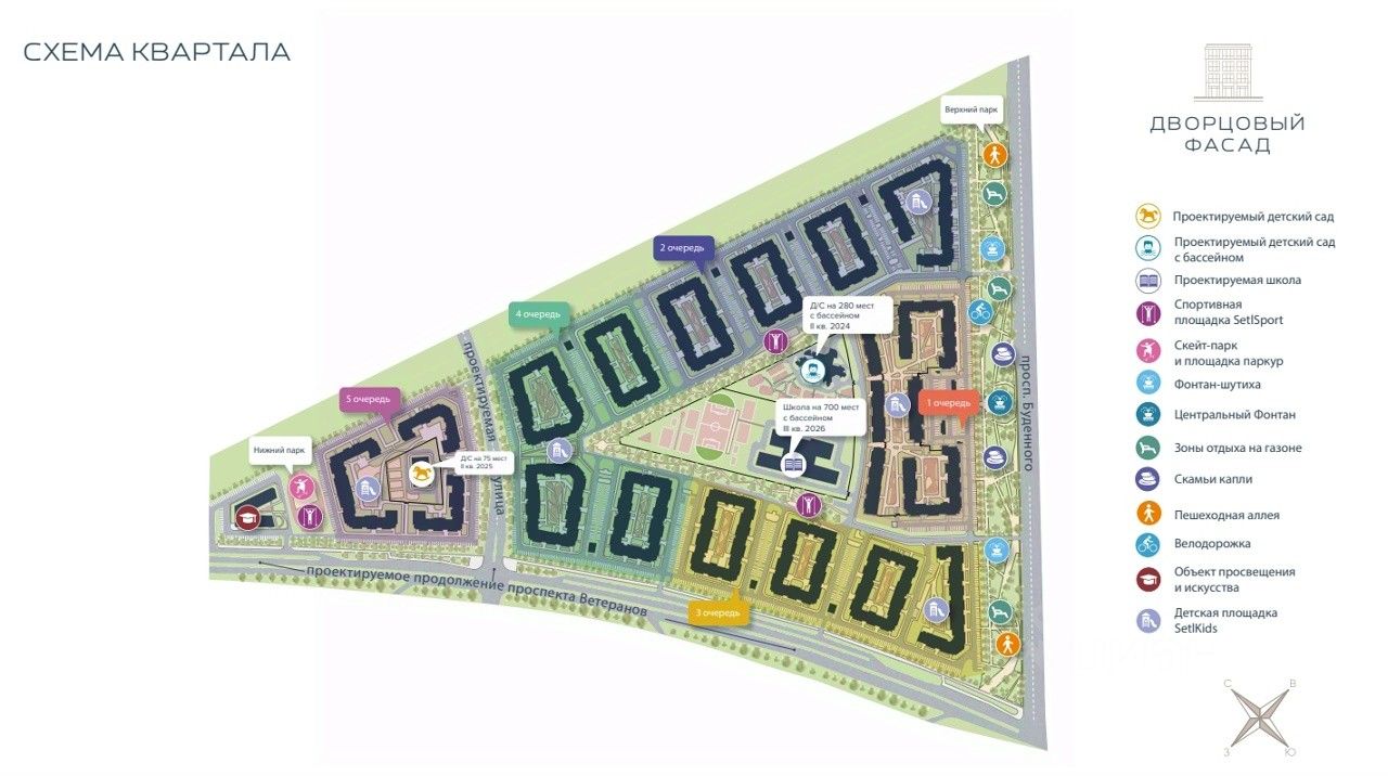 Квартира располагается в малоэтажном жилом комплексе Дворцовый Фасад, который располагается в Петродворцовом районе Санкт-Петербурга, рядом с дворцовыми ансамблями Стрельны и Петергофа. Жилой комплекс состоит из 18-ти четырёхэтажных корпусов. В составе инфраструктуры - два детских сада, школа с бассейном, зоны для отдыха, а также детская площадка SetlKids и спортивная площадка SetlSport. В ЖК обустроены приватные уютные дворы-патио, свободные от машин.