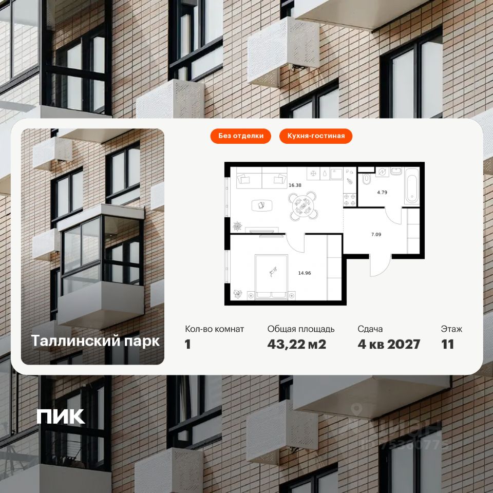 Продаётся 1-комн. квартира площадью 43,22 кв.м на 11 этаже 12 этажного дома (Корпус 4.2, Секция 1) проекта ПИК Таллинский парк. Светлый просторный подъезд на уровне земли, функциональная планировка, большие окна, без отделки.
