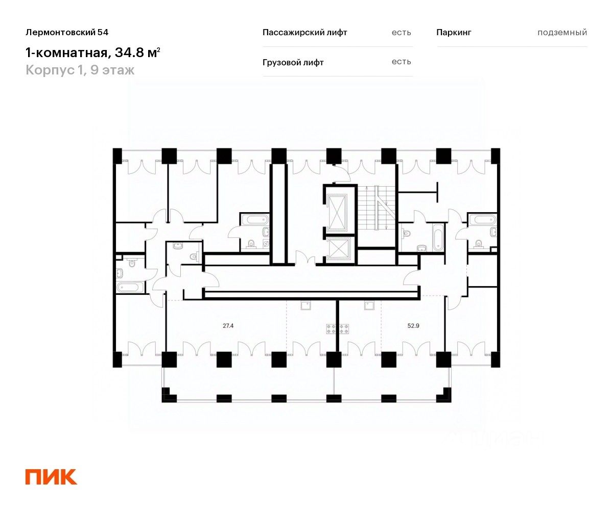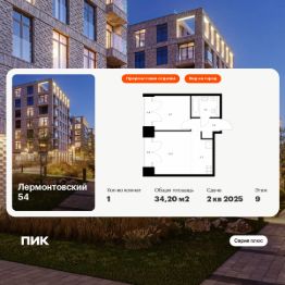 Продаётся 1-комн. квартира площадью 34,2 кв.м на 9 этаже 9 этажного дома (Корпус 1, Секция 6) проекта ПИК Лермонтовский 54. Светлый просторный подъезд на уровне земли, функциональная планировка, большие окна, предчистовая отделка.