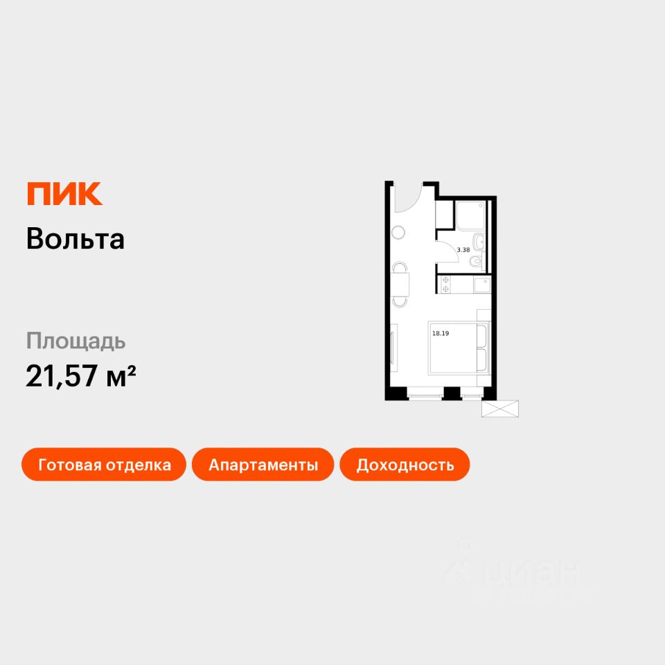 Продаются апартаменты-студия площадью 21,57 кв.м на 5 этаже 15 этажного дома (Вольта, Секция 1) проекта ПИК Вольта.
