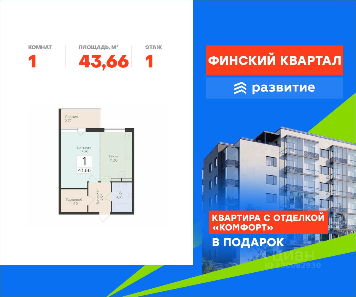 Продается квартира площадью 43.66 кв. м без отделки. Квартира расположена на 1 этаже 8 этажного дома, в жилом комплексе комфорт-класса "Финский Квартал".