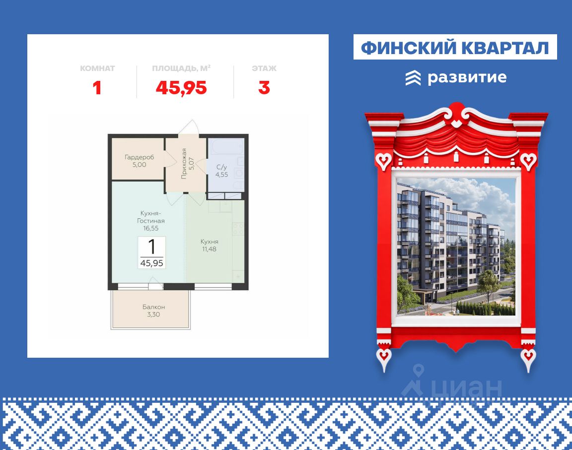 "Продается квартира площадью 45.95 кв. м с предчистовой отделкой. Квартира расположена на 3 этаже 8 этажного дома, в жилом комплексе комфорт-класса "Финский Квартал".