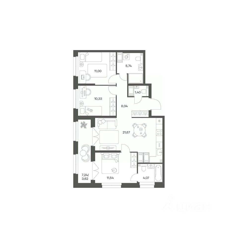Квартал рассчитан на семейных покупателей, поэтому здесь нет студий: только одно-, двух- и трёхкомнатные квартиры. В проекте представлены квартиры с кухнями-гостиными, мастер-спальнями, гардеробными и кладовыми.