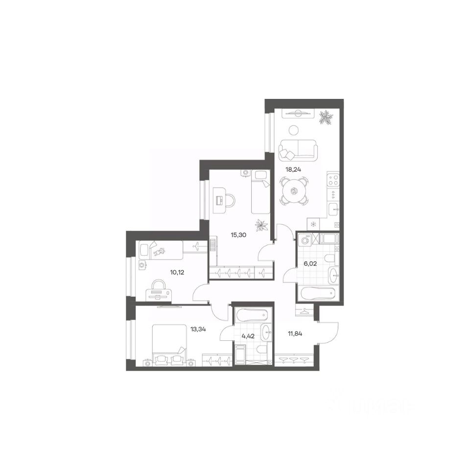 Квартал рассчитан на семейных покупателей, поэтому здесь нет студий: только одно-, двух- и трёхкомнатные квартиры. В проекте представлены квартиры с кухнями-гостиными, мастер-спальнями, гардеробными и кладовыми.
