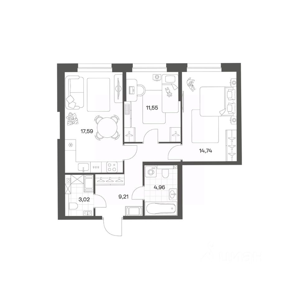 Квартал рассчитан на семейных покупателей, поэтому здесь нет студий: только одно-, двух- и трёхкомнатные квартиры. В проекте представлены квартиры с кухнями-гостиными, мастер-спальнями, гардеробными и кладовыми.
