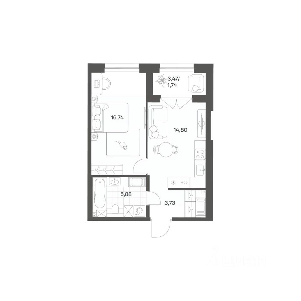 Продается квартира площадью 42.89 м²