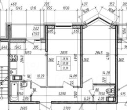 (На фото планировка строительная, после переобмера по ПИБ площадь квартиры составляет 53,5 с коэффициентом балкона).