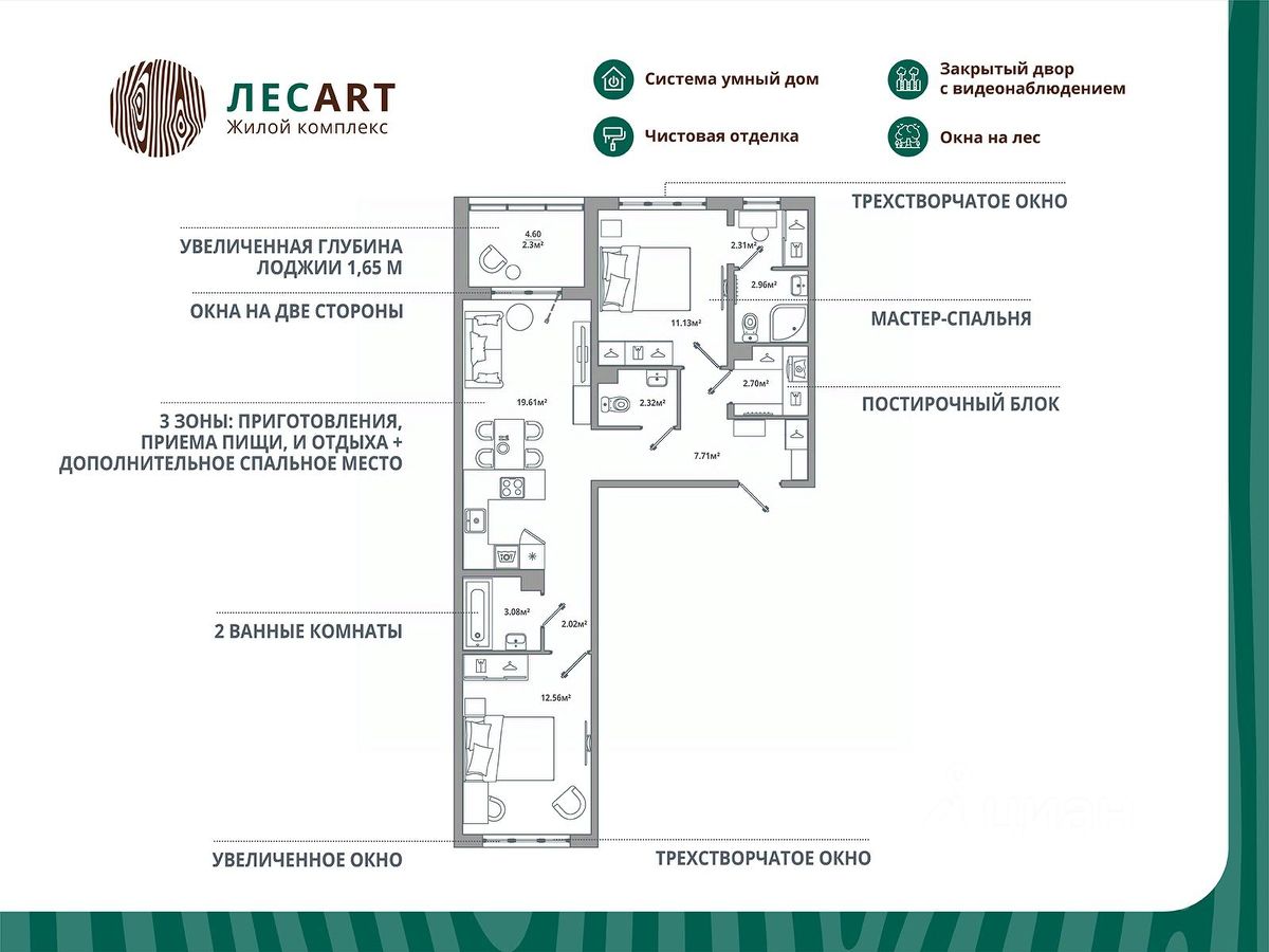 Продаётся 2-комнатная квартира 242, общей площадью 68.7 кв.м., на 8. Дом комфорт-класса, 12 этажей, в окружении леса и малоэтажной застройки. Проект с умным домом. Передача квартир в апреле 2026г.