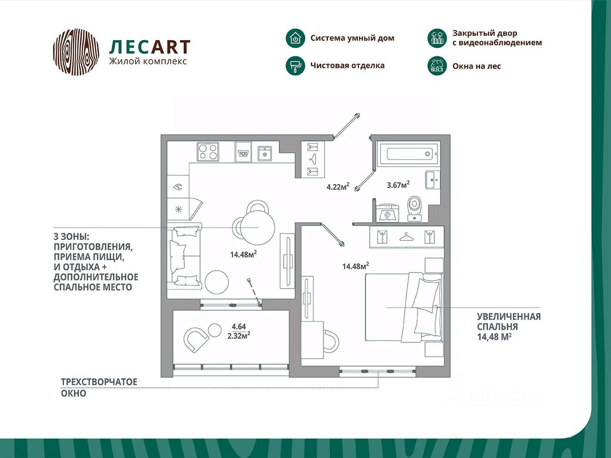 Продаётся 1-комнатная квартира 090, общей площадью 39.17 кв.м., на 8. Дом комфорт-класса, 12 этажей, в окружении леса и малоэтажной застройки. Проект с умным домом. Передача квартир в апреле 2026г.
