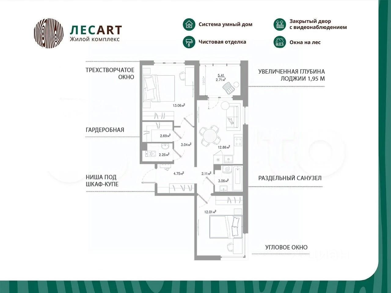 Продаётся 2-комнатная квартира 041, общей площадью 58.55 кв.м., на 11. Дом комфорт-класса, 12 этажей, в окружении леса и малоэтажной застройки. Проект с умным домом. Передача квартир в апреле 2026г.