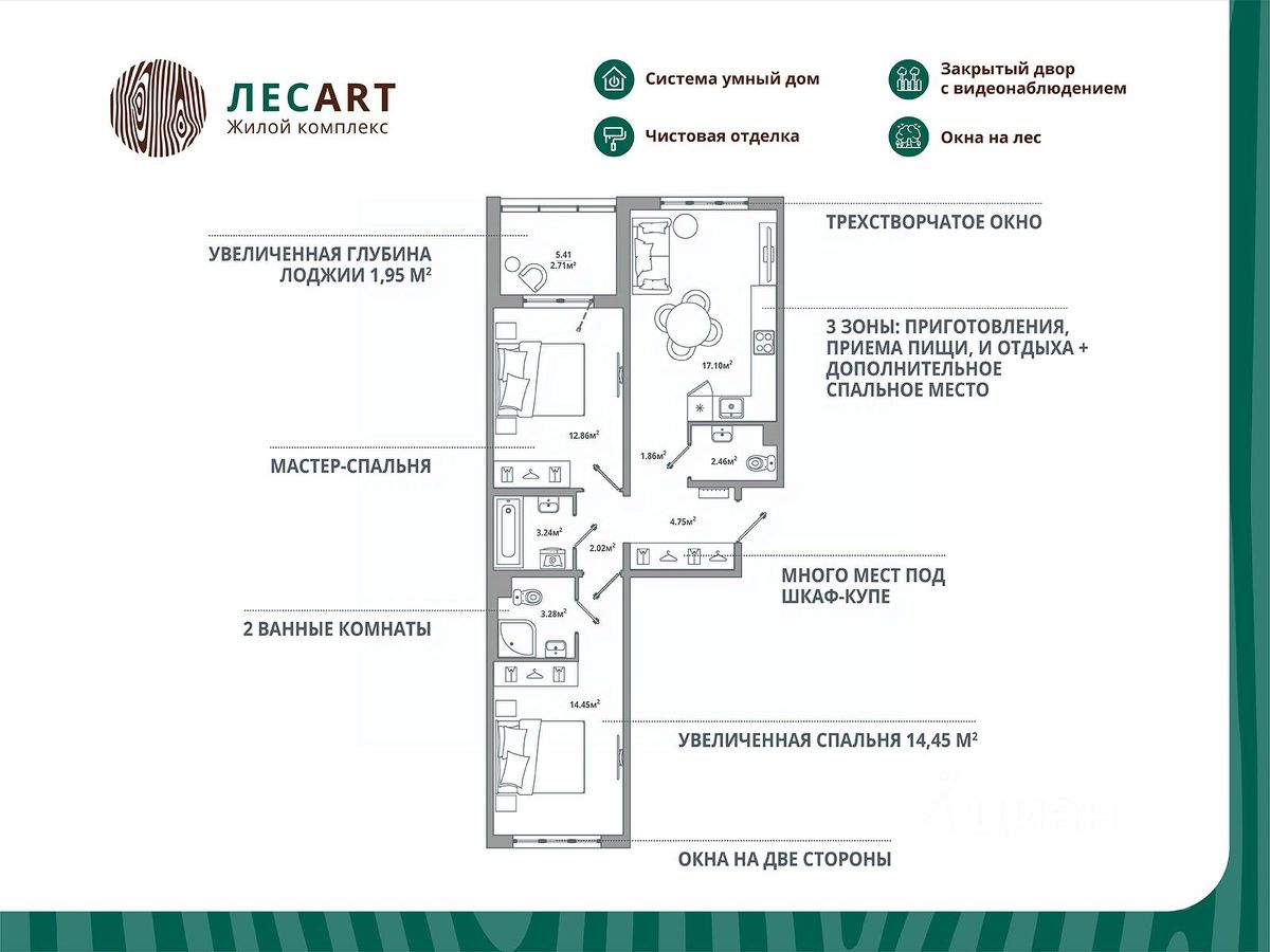 Продаётся 2-комнатная квартира 048, общей площадью 64.73 кв.м., на 12. Дом комфорт-класса, 12 этажей, в окружении леса и малоэтажной застройки. Проект с умным домом. Передача квартир в апреле 2026г.