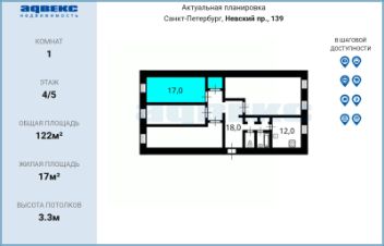 Общая площадь квартиры составляет 122 кв.м, из них кухня занимает 12 кв.м.