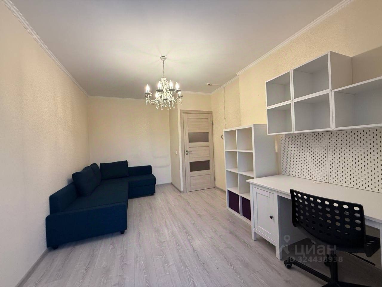 • КОМНАТА: 13,5 м². Остается письменный стол для работы, стеллаж, удобный раскладной диван, небольшой стеллаж, навесные полки и рабочее кресло.