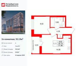 Удобная, классическая, функциональная европланировка, большая кухня-гостиная 14 м², просторная прихожая 4.35 м². Общая площадь квартиры - 30.19 м², жилая 8.02 м², высота потолка 2.77 м.