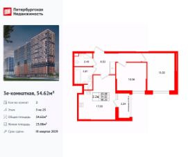 Удобная, классическая, функциональная европланировка, большая кухня-гостиная 17 м², просторная прихожая 8.53 м². Общая площадь квартиры - 54.62 м², жилая 23.08 м², высота потолка 2.77 м.