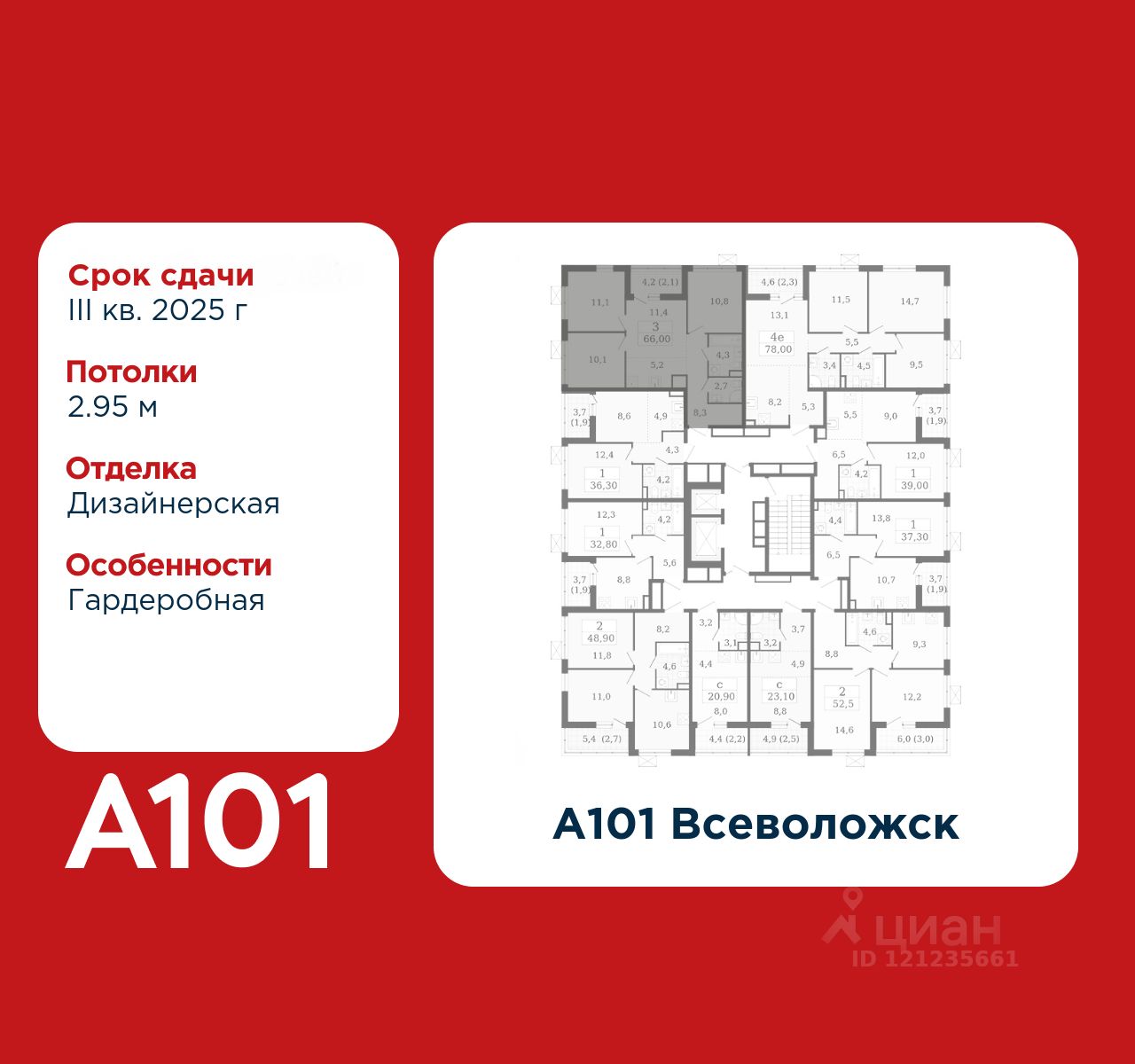 3-комнатная квартира площадью 66.20 в ЖК "А101 Всеволожск" c лоджией на 3 этаже. Квартира с отделкой. Вид из окна во двор. В квартире 2 санузла. Высота потолков 2.95 м. Особенность планировки - гардеробная.
