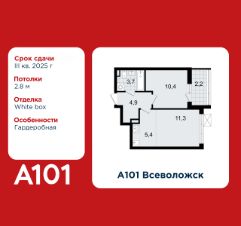 2-комнатная квартира площадью 38.00 в ЖК "А101 Всеволожск" c лоджией на 11 этаже. Квартира white box. Вид из окна во двор. В квартире 1 санузел. Высота потолков 2.8 м. Особенность планировки - гардеробная.