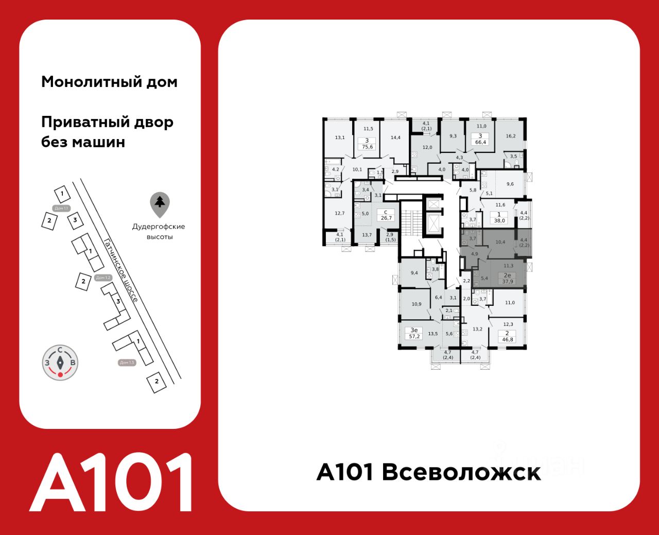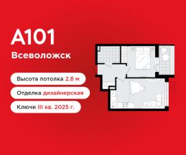 2-комнатная квартира площадью 38.00 в ЖК "А101 Всеволожск" c лоджией на 11 этаже. Квартира с предчистовой отделкой. Вид из окна во двор. В квартире 1 санузел. Высота потолков 2.80 м.