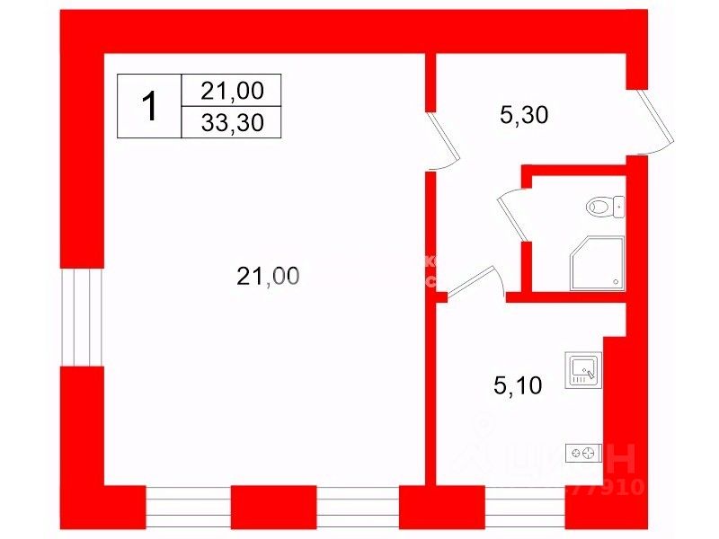 Площадь: 33,3 м?. Просторная комната 21 м с 3мя окнами разделена на 2 комнаты.
