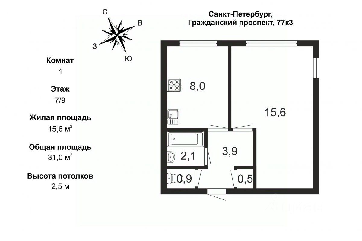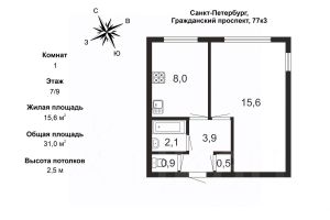 В продаже 1 к.кв. общей площадью 31,0 кв.м.