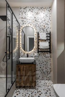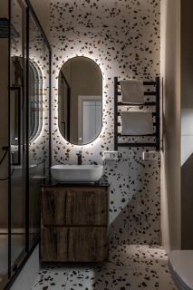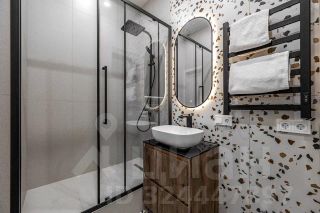 В санузле установлена душевая кабина с системой тропического душа, также предусмотрен шкаф для хранения моющих средств. Санузел оснащен теплым полом.