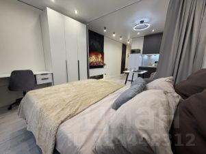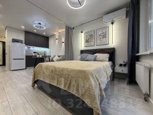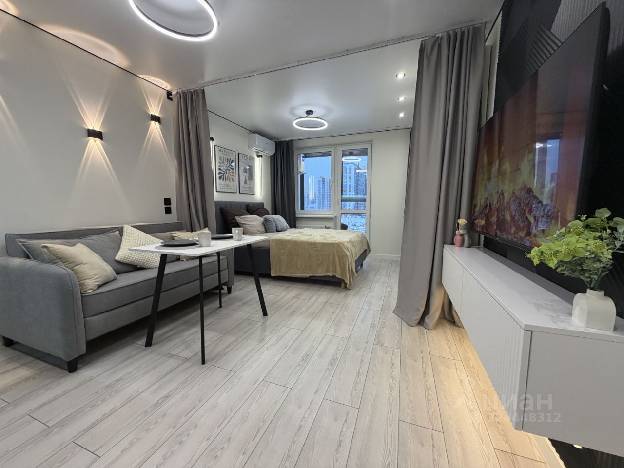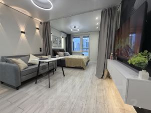 - Большая комната, разделена на две зоны: кухня-гостиная с диваном и телевизором, и спальная зона - с кроватью, и рабочим местом.