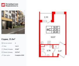 Удобная, классическая, функциональная европланировка, просторная прихожая 3.47 м². Общая площадь студии - 25.8 м², жилая 18.57 м², высота потолка 2.77 м.