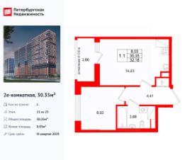 Удобная, классическая, функциональная европланировка, большая кухня-гостиная 14.23 м², просторная прихожая 4.41 м². Общая площадь квартиры - 30.35 м², жилая 8.03 м², высота потолка 2.77 м.