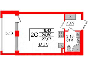 Площадь: 24,3 м2 + 5,13 м2 лоджия, высота потолка 2,75 м.