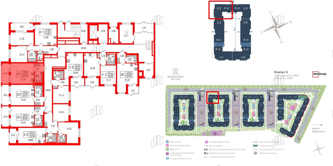 Квартира располагается в малоэтажном жилом комплексе Дворцовый Фасад, который располагается в Петродворцовом районе Санкт-Петербурга, рядом с дворцовыми ансамблями Стрельны и Петергофа. Жилой комплекс состоит из 18-ти четырёхэтажных корпусов. В составе инфраструктуры - два детских сада, школа с бассейном, зоны для отдыха, а также детская площадка SetlKids и спортивная площадка SetlSport. В ЖК обустроены приватные уютные дворы-патио, свободные от машин.