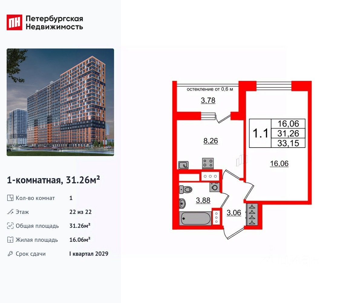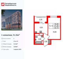Удобная, классическая планировка, кухня 8.26 м², вместительная прихожая 3.06 м². Общая площадь квартиры - 31.26 м², жилая 16.06 м², высота потолка 3 м.