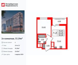 Удобная, классическая, функциональная европланировка, большая кухня-гостиная 15.44 м², вместительная прихожая 3.83 м². Общая площадь квартиры - 33.29 м², жилая 10.43 м², высота потолка 2.77 м.