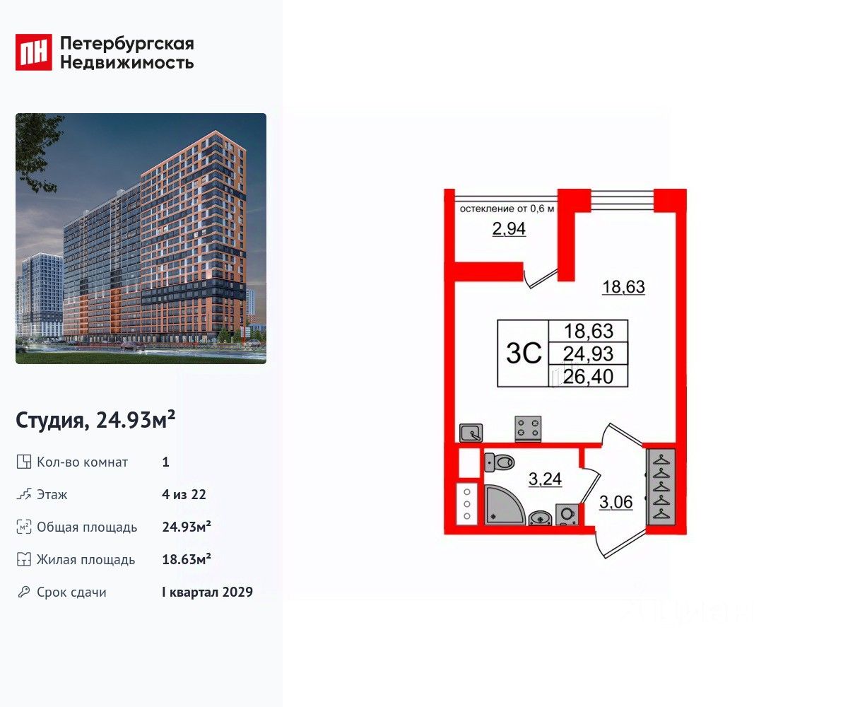 Удобная, классическая, функциональная европланировка, вместительная прихожая 3.06 м². Общая площадь студии - 24.93 м², жилая 18.63 м², высота потолка 2.77 м.