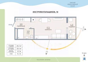 Студия площадью 26,6 м² с большой застеклённой лоджией расположена в тихой курортной части Сестрорецка — у берега канала в лесопарке Гагарка, в окружении природных заповедников и всего в нескольких минутах от Финского залива.