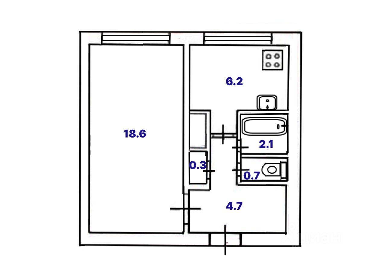 Уютная кухня - столовая 6.2 кв.м. Жилая комната 18.6 кв.м. с возможностью разделения на гостевую и спальную зоны. Кладовая 0.3 кв.м. Прихожая 4.7 кв.м. с местом под шкаф. Санузел раздельный. Вид во двор.