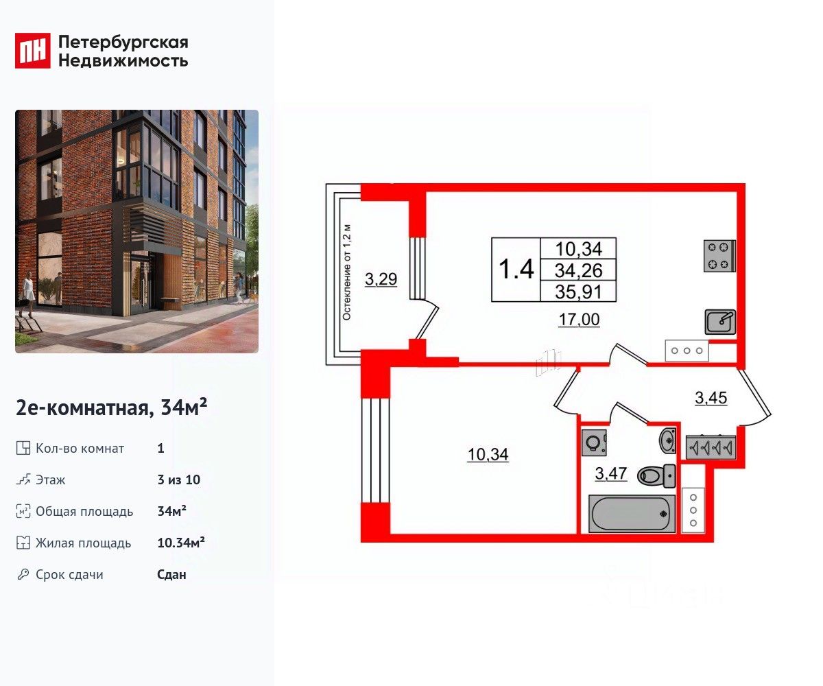 Удобная, классическая, функциональная европланировка, большая кухня-гостиная 17 м², вместительная прихожая 3.45 м². Общая площадь квартиры - 34 м², жилая 10.34 м², высота потолка 2.77 м.